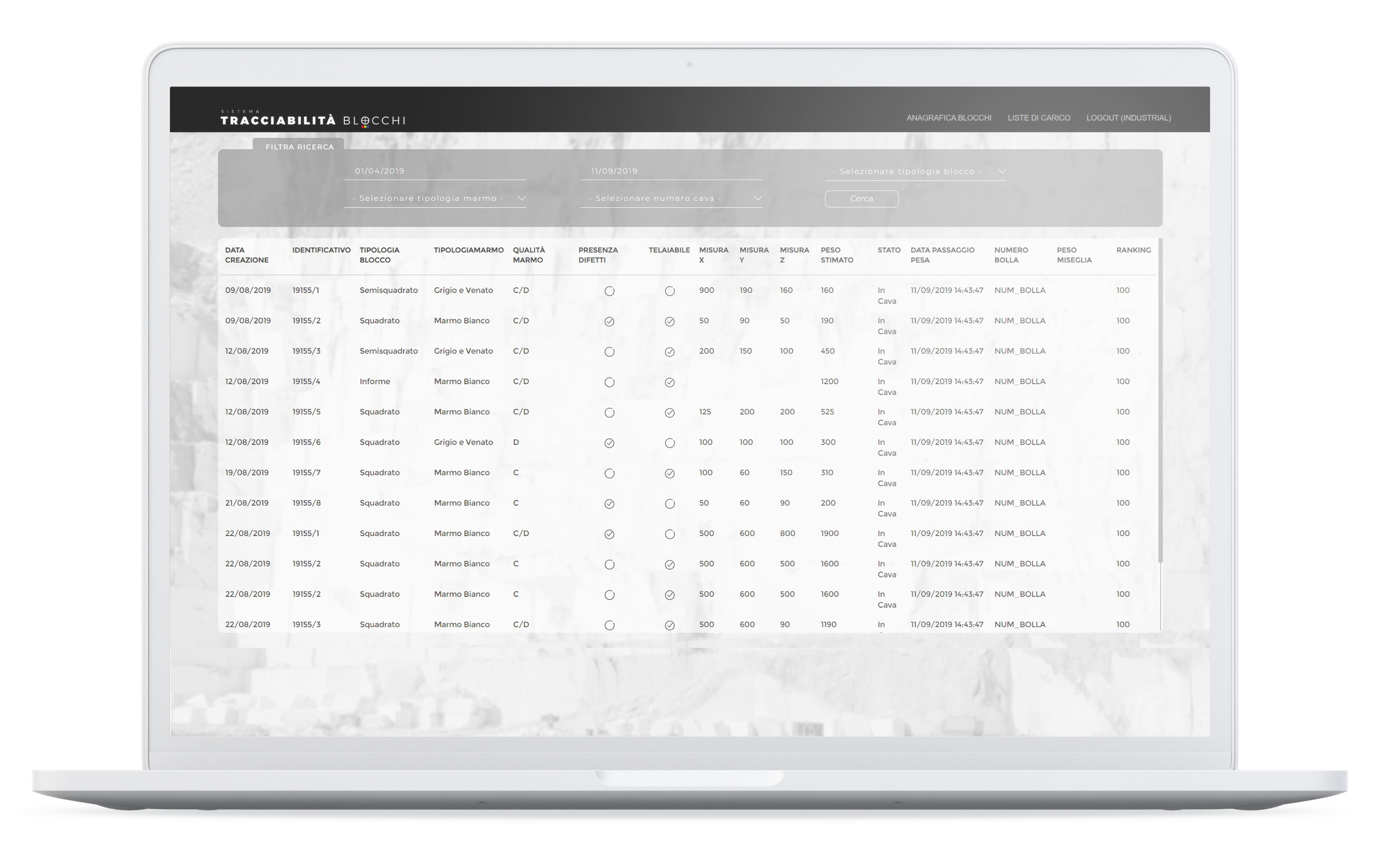 Il sistema di tracciabilità dei blocchi, ideato e realizzato per il Comune di Carrara dalla ditta Industrial Software SRL, ha lo scopo di certificare la reale provenienza dei blocchi di marmo e di costruire e rendere disponibile a tutti una banca dati dei blocchi prodotti.